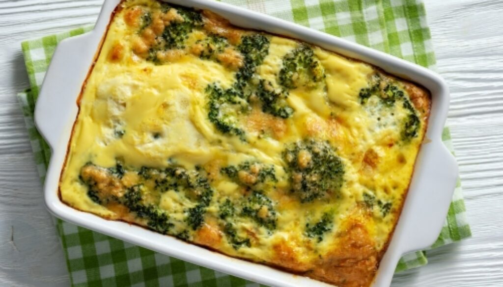 Den Auflauf im Ofen 30–40 Minuten backen, bis die Oberfläche goldgelb ist und die Masse gestockt ist. Vor dem Servieren kurz ruhen lassen.